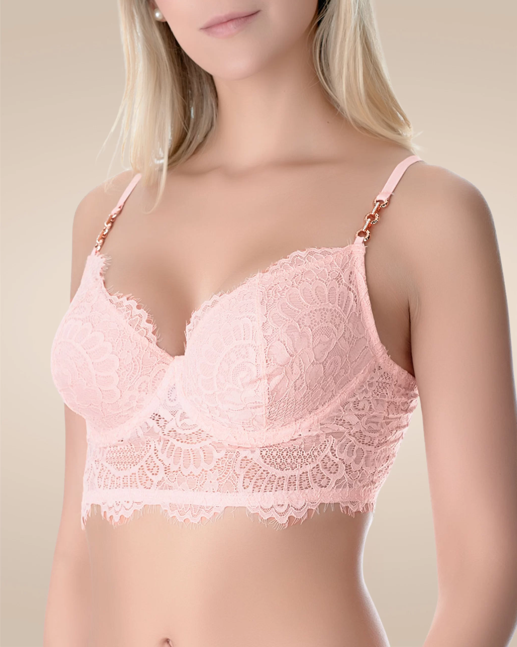 En encaje con accesorio en las tiras oro rosa en zamak antialérgico con cristales incrustados.